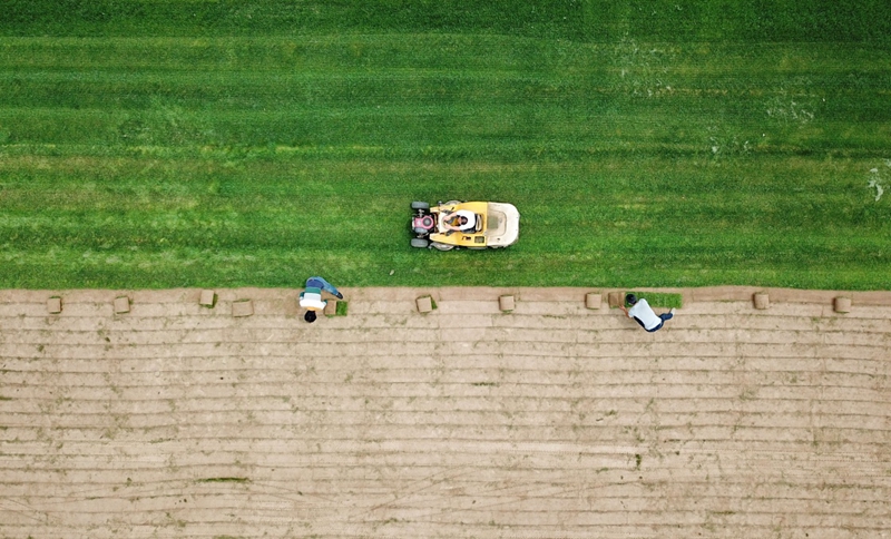 5月12日,滄縣鴻楊草坪種植專業(yè)合作社的社員們?cè)谛藜簟⑹站聿萜海o人機(jī)拍攝)。