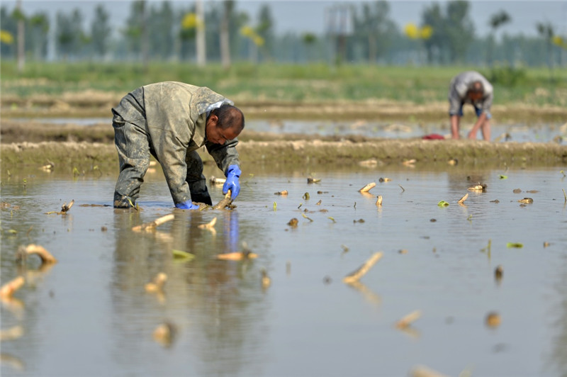 5月14日,河北省隆堯縣東良鎮(zhèn)澤畔村的農(nóng)民在種植蓮藕。