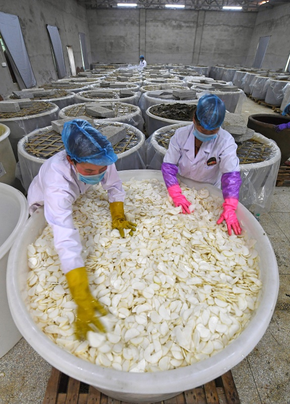 近年來(lái),江西省南昌縣三江鎮(zhèn)發(fā)揮本地蔬菜種植優(yōu)勢(shì),通過(guò)挖掘當(dāng)?shù)仉绮藗鹘y(tǒng)制作工藝,打造“秀挹三江”品牌,大力發(fā)展腌菜特色加工產(chǎn)業(yè)。2017年三江鎮(zhèn)腌菜產(chǎn)業(yè)銷售額達(dá)700萬(wàn)元,帶動(dòng)生產(chǎn)農(nóng)戶400多戶,從業(yè)農(nóng)民平均增收約2萬(wàn)元。新華社記者 萬(wàn)象 攝