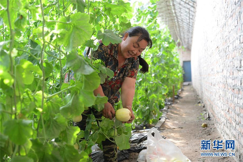 5月21日,在內(nèi)蒙古興安盟烏蘭浩特市葛根廟鎮(zhèn),鐘淑霞在自家大棚摘香瓜。