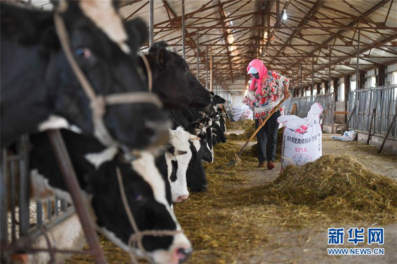 5月21日,在內(nèi)蒙古興安盟烏蘭浩特市葛根廟鎮(zhèn)的扶貧示范基地奶牛養(yǎng)殖場內(nèi),飼養(yǎng)員為奶牛添加飼料。