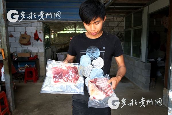 韋興寬的兒子拿著真空包裝的豬肉展示