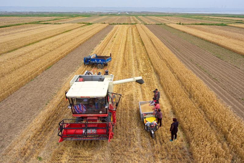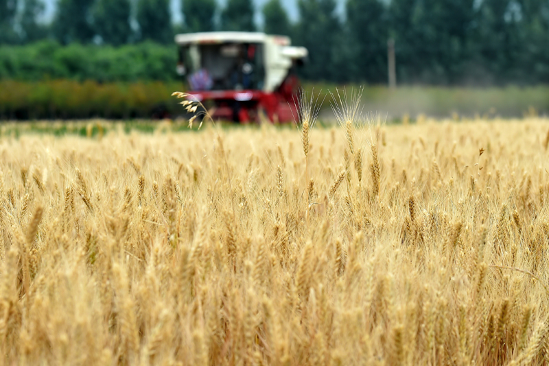 5月29日,聯(lián)合收割機在山西省運城市鹽湖區(qū)蠶坊村實施田間作業(yè)。