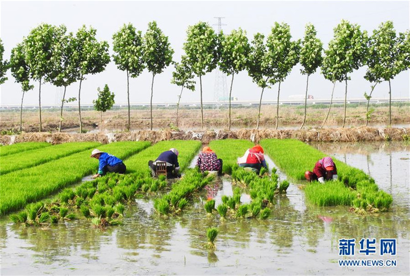 近日,江蘇連云港市青口鹽場2萬畝復(fù)墾鹽田進(jìn)入海水稻全面插秧階段,田間地頭一片繁忙景象。耐鹽堿水稻俗稱海水稻,是一種可以生長在灘涂和鹽堿地的水稻。連云港市隨著產(chǎn)業(yè)結(jié)構(gòu)調(diào)整,確定了沿海鹽田逐步退出鹽業(yè)生產(chǎn)的產(chǎn)業(yè)部署,實(shí)施鹽田復(fù)墾轉(zhuǎn)養(yǎng)、轉(zhuǎn)農(nóng)工程,采取多種方式使百里鹽田逐步升級(jí)為獨(dú)具特色的“沿海糧倉”。新華社發(fā)(耿玉和 攝)