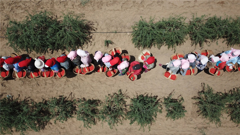 紅寺堡生態(tài)移民區(qū)的移民在百瑞源枸杞種植基地采摘頭茬枸杞(5月30日無人機(jī)拍攝)。