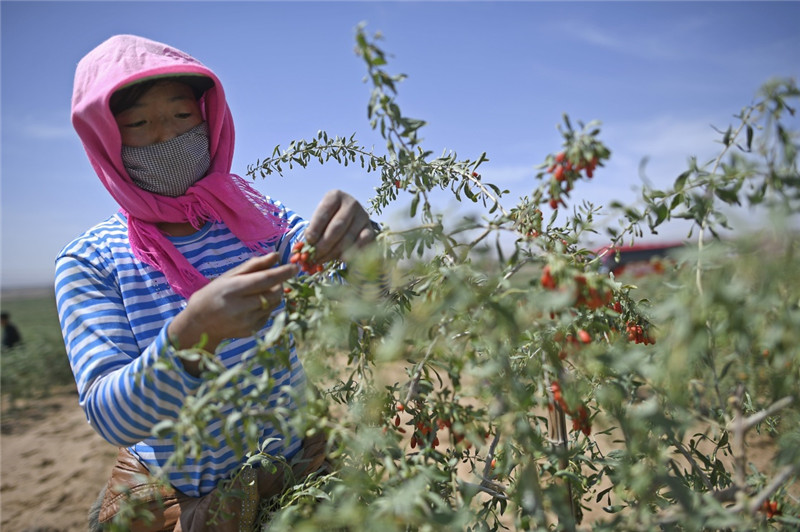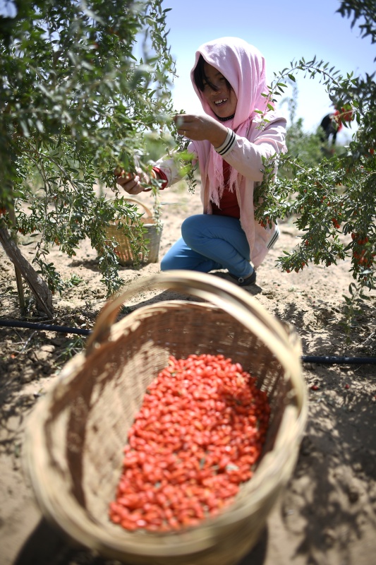 紅寺堡生態(tài)移民區(qū)的移民在百瑞源枸杞種植基地采摘頭茬枸杞(5月30日攝)。