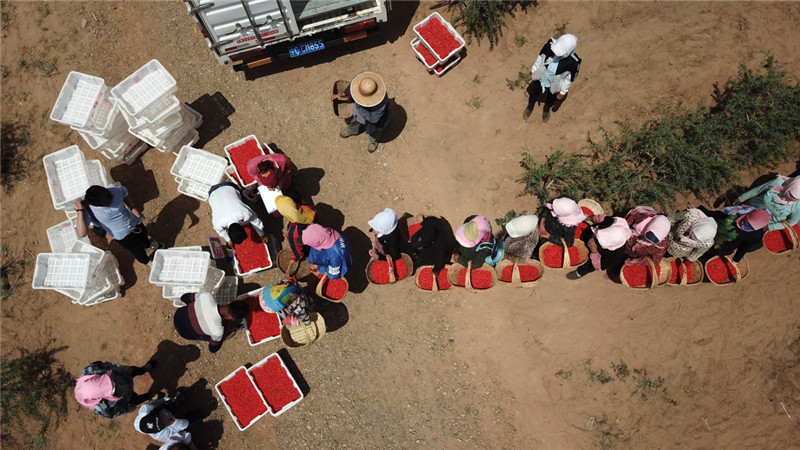 紅寺堡生態(tài)移民區(qū)的移民在百瑞源枸杞種植基地排隊(duì)將采摘的枸杞稱重(5月30日無人機(jī)拍攝)。