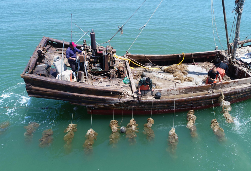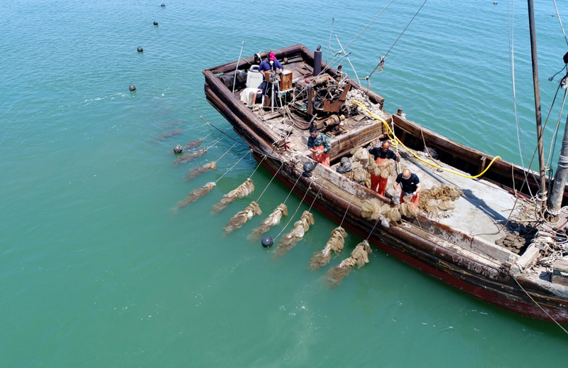 5月31日,樂亭縣興樂海水養(yǎng)殖專業(yè)合作社的員工在扇貝養(yǎng)殖海域掛籠播苗。
