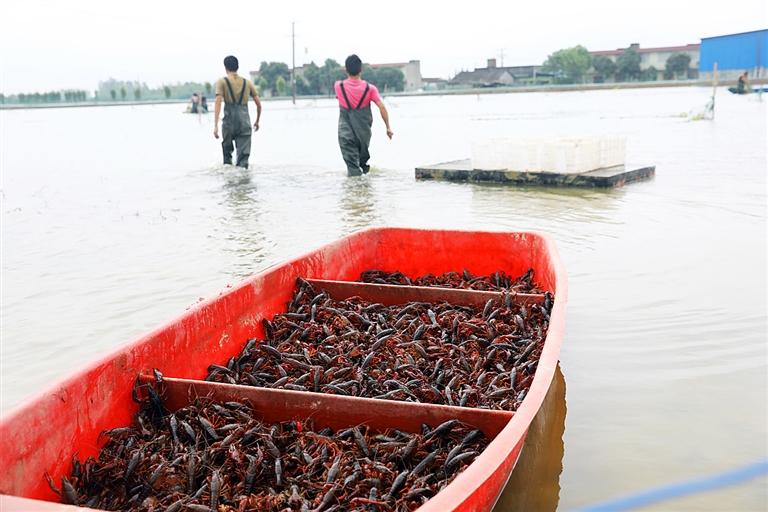 記者看到,一名工人正推著一只小船,在齊膝的水里收前一天放入水中的地籠。一個(gè)籠子收起來,小龍蝦多的有十來斤,少的也有好幾斤。