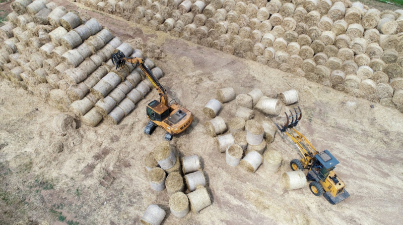 6月11日,在山東省臨沂市郯城縣郯城街道三井村秸稈回收中心,工人駕駛抓草機(jī)整理回收的小麥秸稈(無人機(jī)拍攝)。
