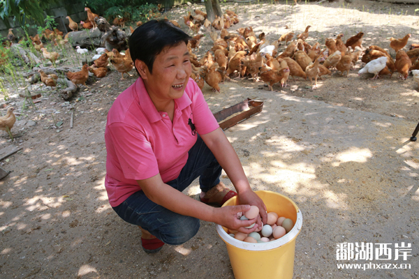 5月17日,55歲的曹愛新正在為雞添飼料,清掃雞舍,看著在眼前啄食的雞群,她臉上洋溢著幸福的笑容。