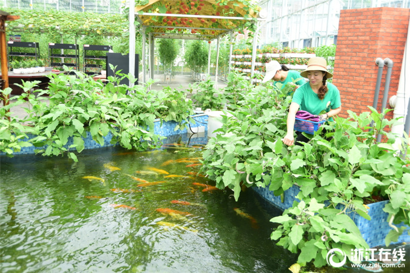 6月19日,在建德市大洋鎮(zhèn)的星空綠谷小鎮(zhèn),管理人員正在采摘采用無(wú)土栽培技術(shù)培育的番茄等蔬菜。