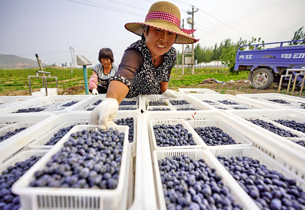 6月20日,灤縣東安各莊鎮(zhèn)三山院村農(nóng)民將采摘的藍(lán)莓稱重。