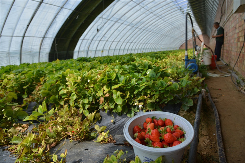 這是6月22日在興勝店村村民大棚中拍攝的剛摘下的草莓。