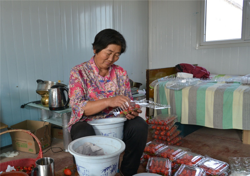 6月22日,興勝店村村民楊春花在包裝自家大棚種植的草莓。