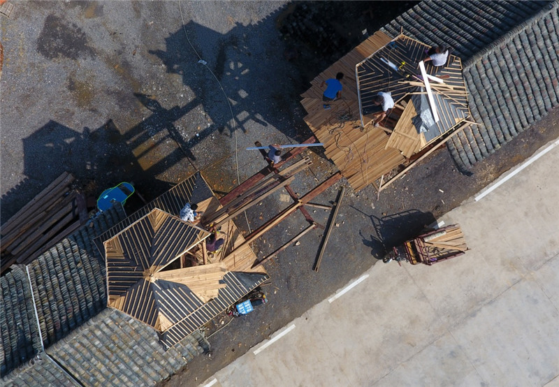 6月26日,在廣西融水雙龍溝森林旅游度假區(qū),工人在施工建設(shè)原生態(tài)苗族文化體驗園(無人機(jī)拍攝)。