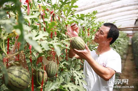 內(nèi)丘縣張奪村九畝地農(nóng)莊王愛軍在查看他的“網(wǎng)紅西瓜”。