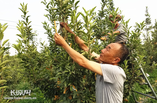 內(nèi)丘縣中張村村支書黃仁相正在和工人在雲(yún)翔果品基地里給蘋果套袋。