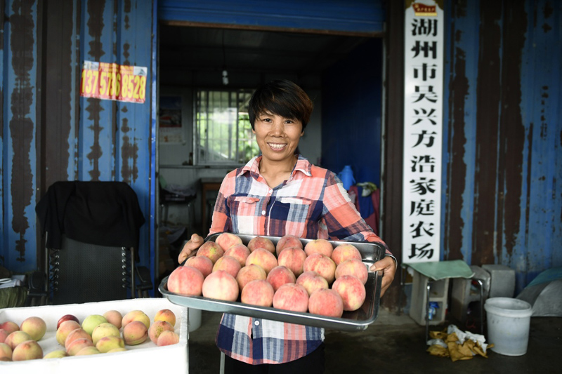 7月1日,浙江省湖州市吳興區(qū)妙西鎮(zhèn)方浩家庭農(nóng)場的農(nóng)戶方琴蓮在展示剛采摘的鮮桃。