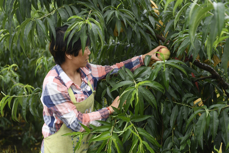 7月1日,浙江省湖州市吳興區(qū)妙西鎮(zhèn)方浩家庭農(nóng)場的農(nóng)戶方琴蓮在采摘鮮桃。