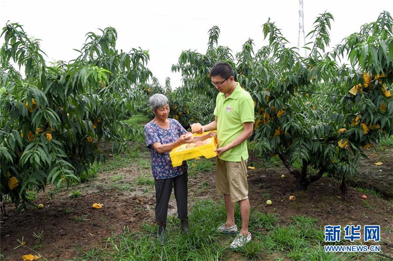 羅圣康(右)和工作人員在無錫市陽山鎮(zhèn)優(yōu)優(yōu)果園專業(yè)合作社種植基地里采摘水蜜桃(7月5日攝)。