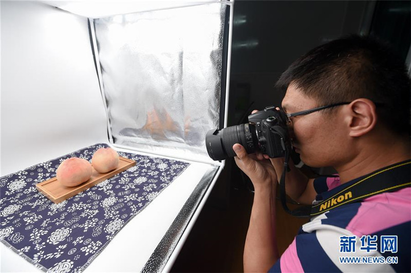 羅圣康在無錫市陽山鎮(zhèn)優(yōu)優(yōu)果園專業(yè)合作社里為水蜜桃拍攝宣傳照片(7月5日攝)。