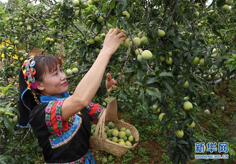 7月7日,元謀縣新華鄉(xiāng)河尾村的彝族婦女李翠香在桃李園采摘鮮果。