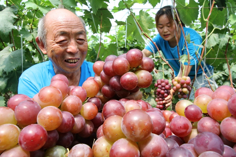 7月8日,河北省魏縣東代固鎮(zhèn)房小莊村村民在采摘葡萄。