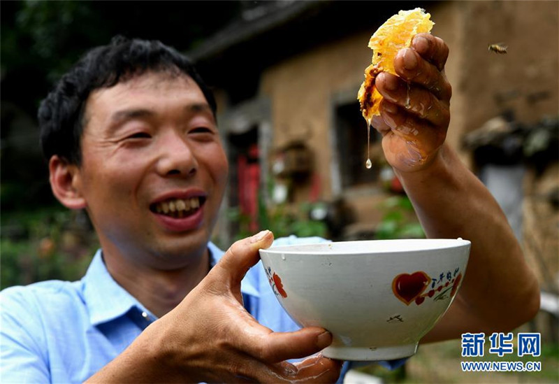 今年37歲的席海水曾是河南省欒川縣潭頭鎮(zhèn)大坪村的建檔立卡貧困戶。2017年初,他加入當(dāng)?shù)匾患曳N養(yǎng)殖合作社,免費(fèi)得到6箱黑巖蜂,還接受了技術(shù)培訓(xùn)和上門指導(dǎo),慢慢摸索到養(yǎng)蜂的門道。如今,席海水熟練掌握了管蜂、取蜜、加工、包裝等一系列工序,手里的蜂箱也從6個(gè)變成了16個(gè)。這份“甜蜜”的事業(yè),成為席海水成功脫貧的重要支撐。2017年秋天,席海水從距離鎮(zhèn)子30多里山路的深山搬出,在鎮(zhèn)上的易地搬遷社區(qū)安了新家。他說:“蜜蜂都勤勞,咱也不能懶,今后我要繼續(xù)養(yǎng)蜂,多發(fā)展些蜂箱,生活肯定越來越好,越來越甜”。新華社記者 李安 攝