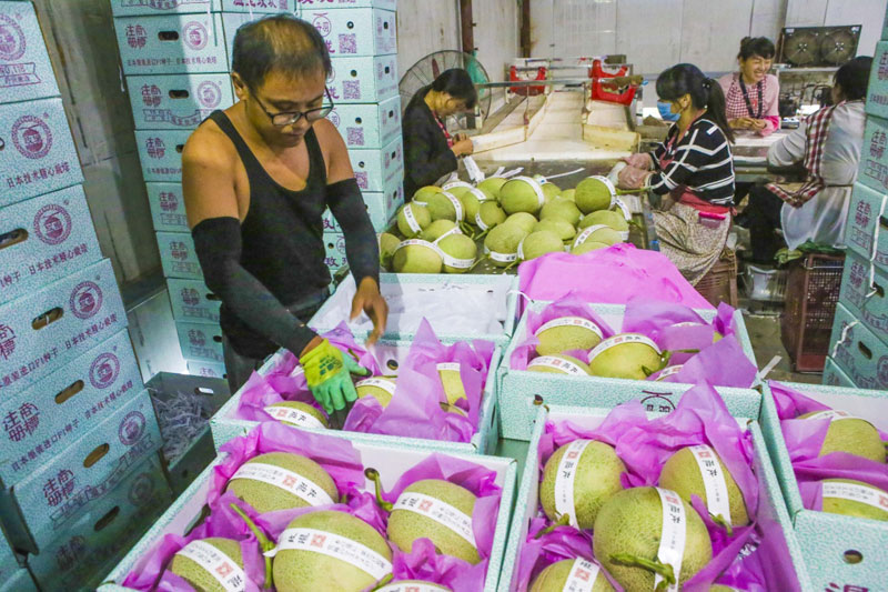 7月11日,河北省饒陽(yáng)縣眾興合作社種植戶在將甜瓜打包裝箱。