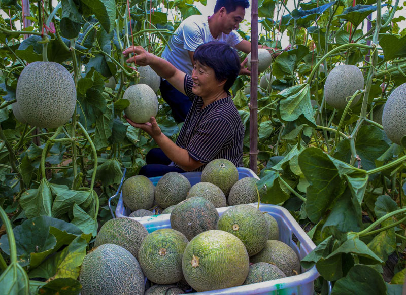 7月11日,河北省饒陽(yáng)縣眾興合作社種植戶在采摘甜瓜。