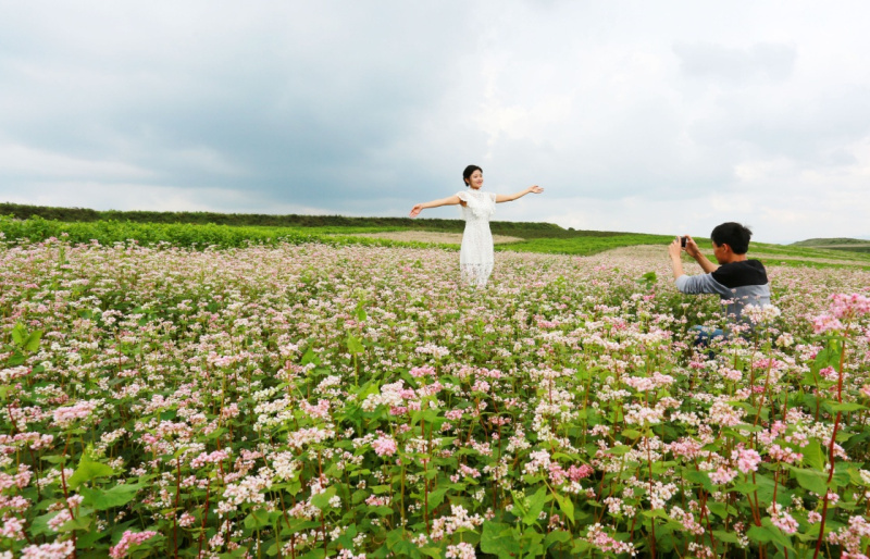 7月12日,游客在貴州威寧板底鄉(xiāng)雄鷹村蕎麥花田中拍照留念。