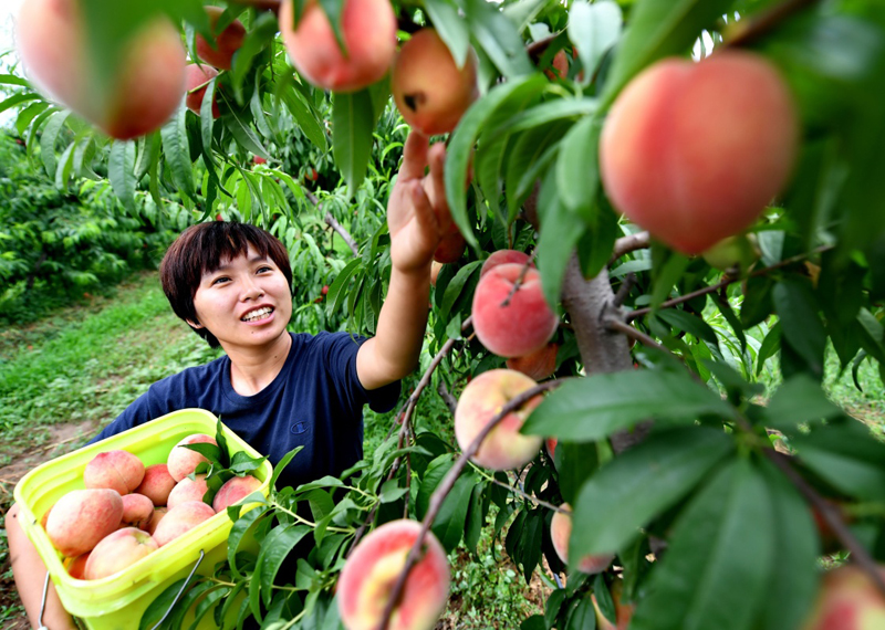 7月14日,靳超在合作社的果園內(nèi)采摘鮮桃。
