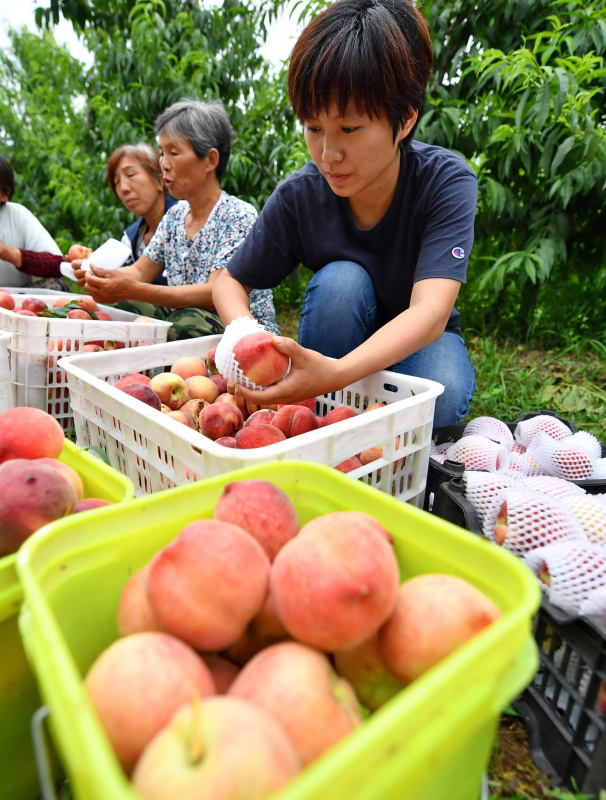 7月14日,靳超在合作社的果園內(nèi)與社員一起將采摘的鮮桃裝箱。