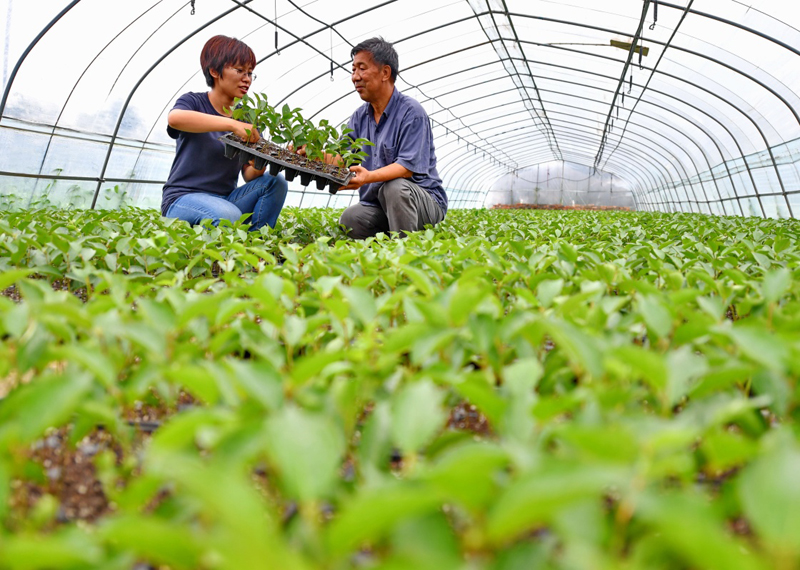 7月14日,靳超(左)與父親在查看使用扦插技術(shù)培育的櫻桃樹苗的長勢。