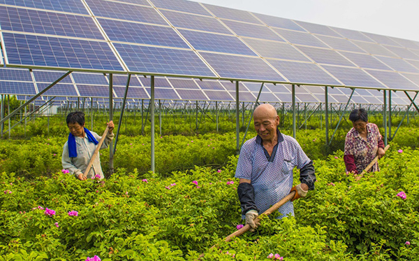 7月18日,農(nóng)民在棗強(qiáng)縣棗強(qiáng)鎮(zhèn)八里莊村“農(nóng)光互補(bǔ)”光伏發(fā)電場的油用玫瑰田里勞作。