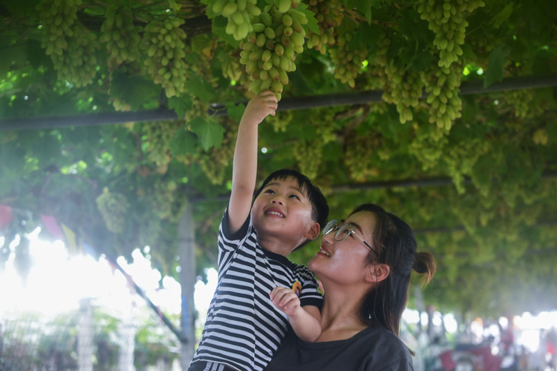7月24日,游客在浙江省長興縣畫溪街道曹家橋村一個葡萄種植園內采摘葡萄。