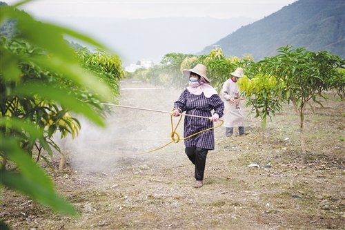 群山環(huán)繞中,岜獨村上千畝的生態(tài)果園盡收眼底,碧綠的四季蜜芒長勢喜人,農(nóng)戶們正忙著給果苗施肥噴藥。