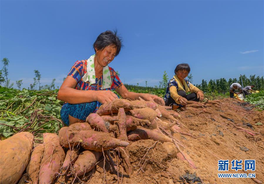 7月26日,在邯鄲市邱縣邱城鎮(zhèn)天恩種植專業(yè)合作社,農(nóng)戶在采收紅薯。