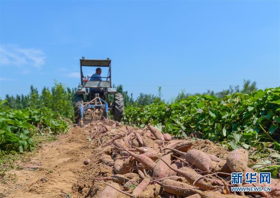 7月26日,在邯鄲市邱縣邱城鎮(zhèn)天恩種植專業(yè)合作社,農(nóng)戶駕駛收割機(jī)采收紅薯。