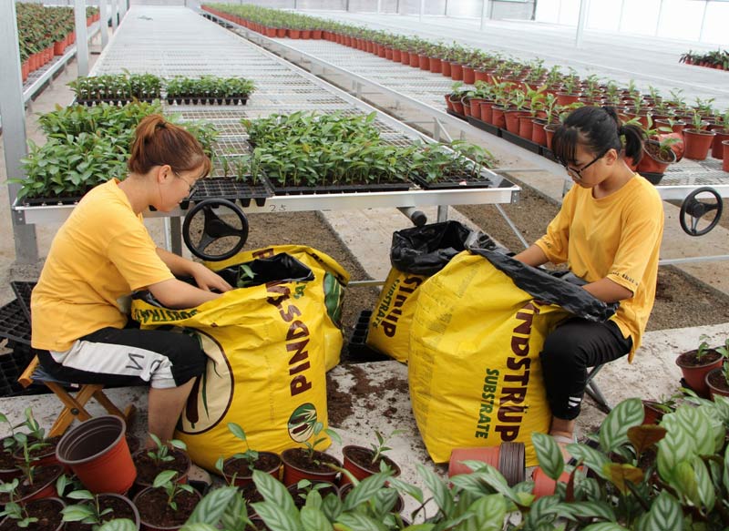 7月26日,石廟鎮(zhèn)村民在惠民縣駿茂花卉公司基地內(nèi)工作。