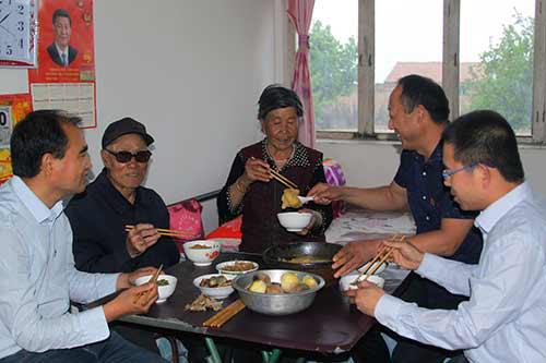 蔚縣縣委組織部駐楊莊窠鄉(xiāng)西坡寨村工作組在貧困戶耿來家中吃派飯。