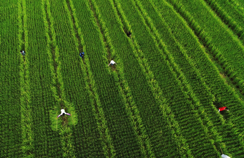 7月30日,農戶在貴州省岑鞏縣思旸鎮(zhèn)國家級雜交水稻制種基地對雜交水稻進行人工授粉(無人機拍攝)。
