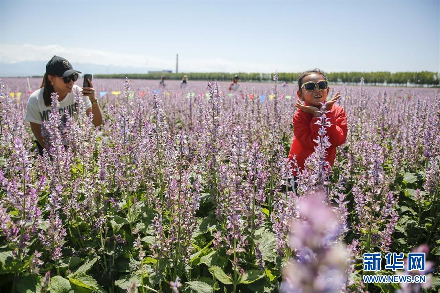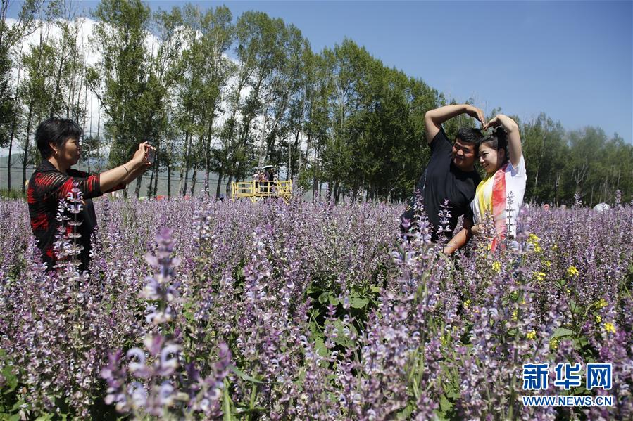 8月1日,來(lái)自新疆霍爾果斯的游客在新疆昭蘇縣一處香紫蘇花海景區(qū)拍照留影。新華社記者黃臻攝