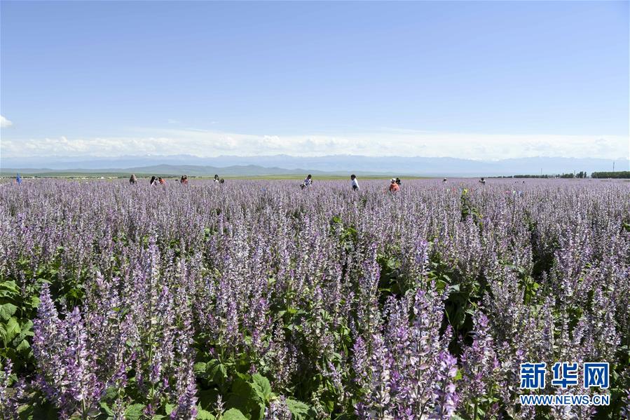 8月1日,在新疆昭蘇縣的一處香紫蘇花海景區(qū),當(dāng)?shù)卮迕駨埿惴加盟崮谈泶裾泻粲慰汀P氯A社記者胡虎虎攝