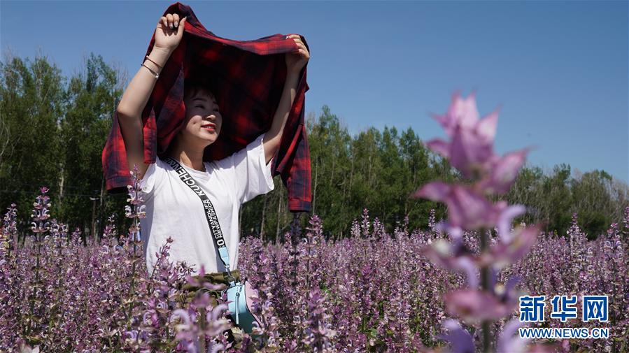 8月1日,游客在新疆昭蘇縣一處香紫蘇花海景區(qū)拍照留影。新華社發(fā)(李夢(mèng)嬌攝)