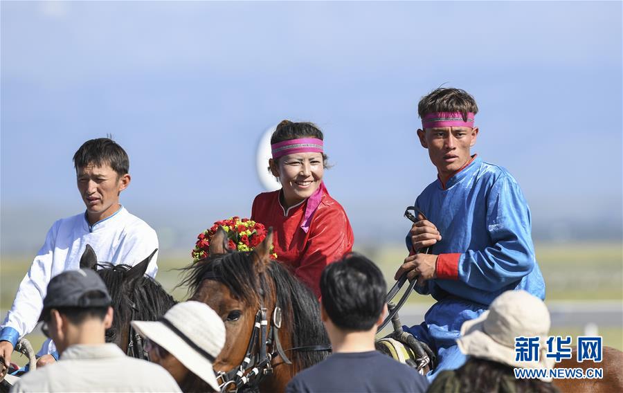 8月1日,在新疆昭蘇縣天馬旅游文化產(chǎn)業(yè)園,肯巴提·買達(dá)力(中)和游客在互動(dòng)。今年5月,她參加了馬術(shù)表演隊(duì),每月收入2000元左右。新華社記者胡虎虎攝