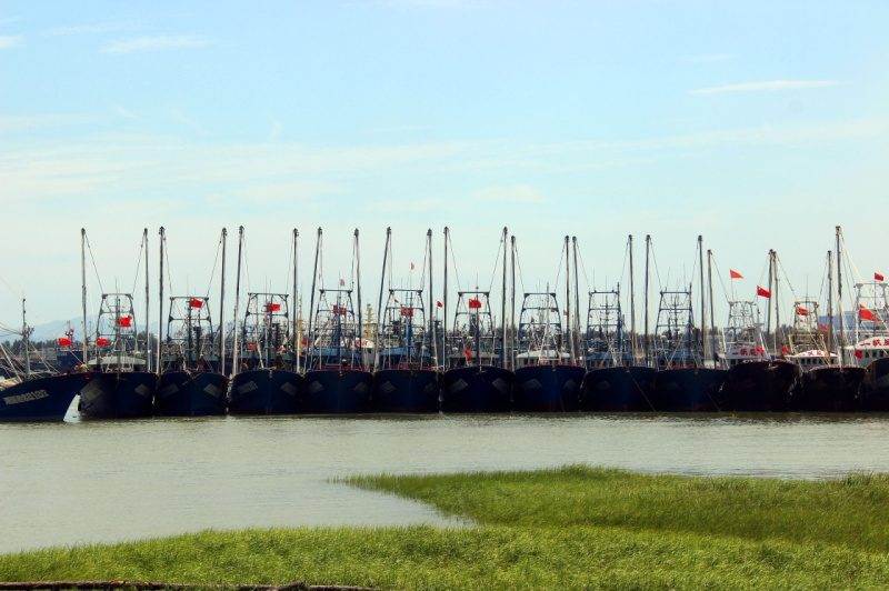 這是8月1日拍攝的停在浙江臺(tái)州金清港的漁船。