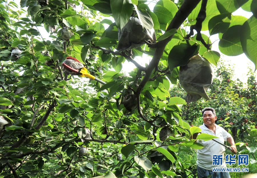 8月4日,河北省泊頭市隆豐店村的梨農(nóng)在采摘套袋生長的梨果。