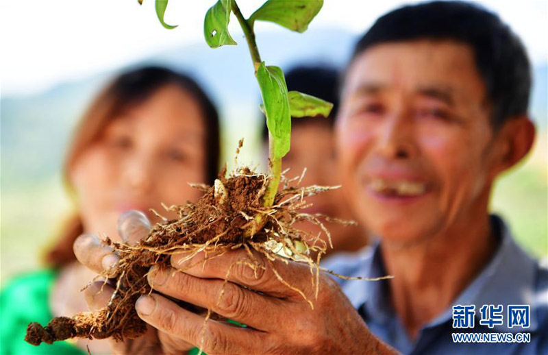 8月5日,陳仙賜(右一)在展示中藥材黃精。他原來是村里的貧困戶,現(xiàn)在養(yǎng)護著村里的50畝黃精,已成功脫貧。